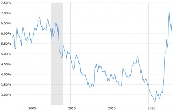 利率上升可能导致企业和消费者的借款成本增加,影响未来盈利预期,并使债券相对于股票更具吸引力。若要了解它如何影响消费者,请参考最近的美国30年期固定抵押贷款利率。这一利率在2023年2月已经恢复上升,达到14年来的最高水平6.5%,而且也伴随着不断增大的丧失抵押品赎回权风险。