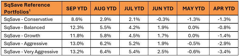 From April’s lows to September’s highs, SqSave reference portfolios have staged a powerful and disciplined recovery. With the exception of Conservative, all portfolios are now showing impressive double-digit YTD 2025 returns, far outpacing their nearest competitors; and showing that AI-powered investing is not just reactive — it’s strategic.